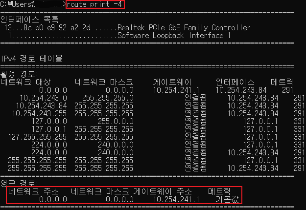 아까 켰던 cmd창에서 route print -4 명령어를 통해 확인할 수 있다.
