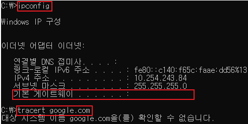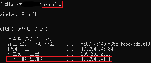 앞에 보이는 검은 화면의 command창에서 ipconfig라는 명령어를 입력하면 자신의 게이트웨이를 확인할 수 있다.