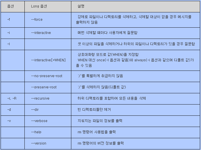 - rm은 디렉터리나 파일을 제거할 때 사용하는 명령어이다.