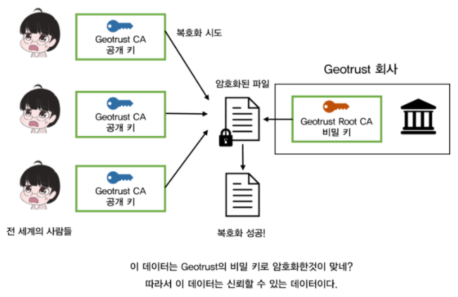 - Root CA는 본인들만의 고유한 비밀 키를 가지고 있고, 이에 대응하는 공개 키를 전 세계에 배포한다. 그리고 세상 사람들은 암묵적으로 이 기관들은 사용할 수 있음을 서로 약속한다. (위의 사진처럼 Geotrust의 공개 키로 복호화가 가능한 데이터는 Geotrust의 비밀키로 암호화되었기 때문에 신용할 수 있는 데이터라고 간주한다.)