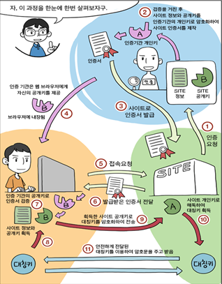 ② 인증기관이 자신의 개인키로 암호화하여 인증서를 만들고 사이트에게 발급한 뒤 사용자에게 자신의 공개키를 제공한다.
