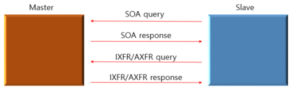 - Master-Slave는 동기화 과정을 통해 zone 파일을 관리하게 되는데, zone 파일의 SOA 필드에 있는 serial을 확인하여 이 파일이 업데이트가 되었는지 판단한다. Serial이 증가했을 경우 파일이 업데이트된 것으로 판단하고 동기화 과정을 통해 Slave 서버로 zone 파일이 전송된다.