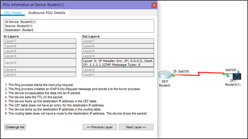 packet tracer로 예시를 들자면 라우터와 라우터가 통신을 하던 도중 통신이 되지 않아 패킷을 까 보았는데 위 사진처럼 3 계층에 문제가 생겼고 IP 주소를 찾을 수 없기 때문에 패킷을 드롭시킨다는 것을 확인할 수 있다.