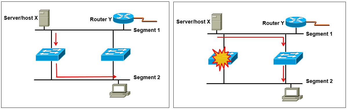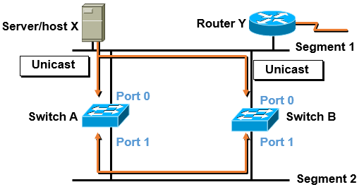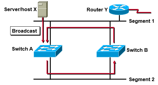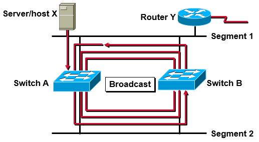 - Host X가 Broadcast를 보내면 양쪽 스위치로 전달이 된다. (이더넷 특성상 같은 세그먼트에 있는 모든 네트워크 장비에 브로드캐스트가 전달됨)