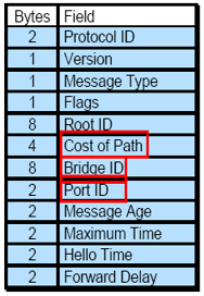 - 필드중에서 switch 네트워크의 논리적인 토폴로지를 경정하기 위해 Bridge ID, Path cost, Port ID 값을 사용한다.